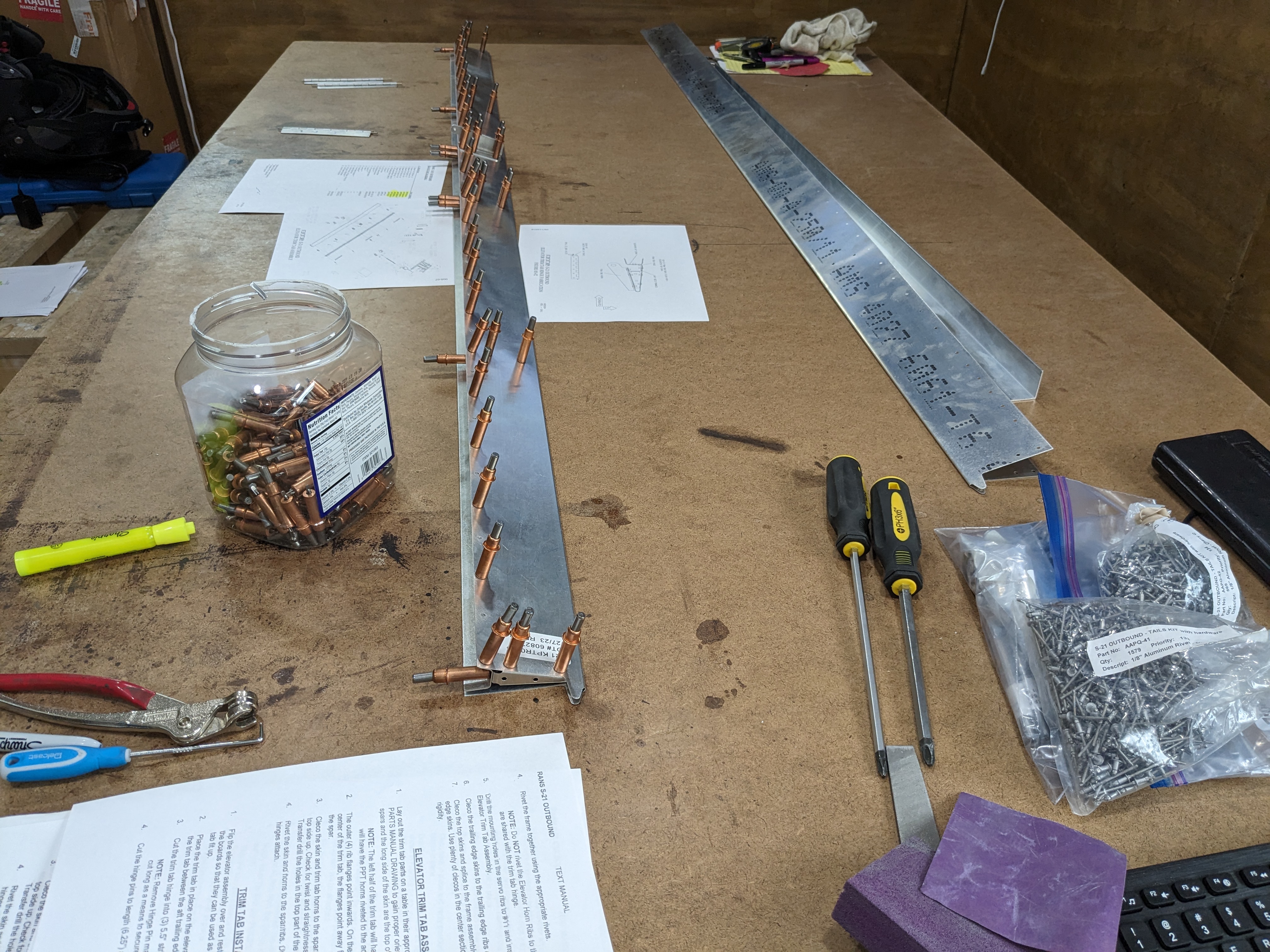 Found all the trim tab parts, read the instructions over and over, cut and filed the hinges, and assembled the tab, I think correctly... Some confusing language in the manual and watching some youtubers do it incorrectly made me second guess myself a number of times... Along with spars that are drilled the same with holes in the right spar that aren't used... All this added to a lot of reading, re-reading, and youtubering...