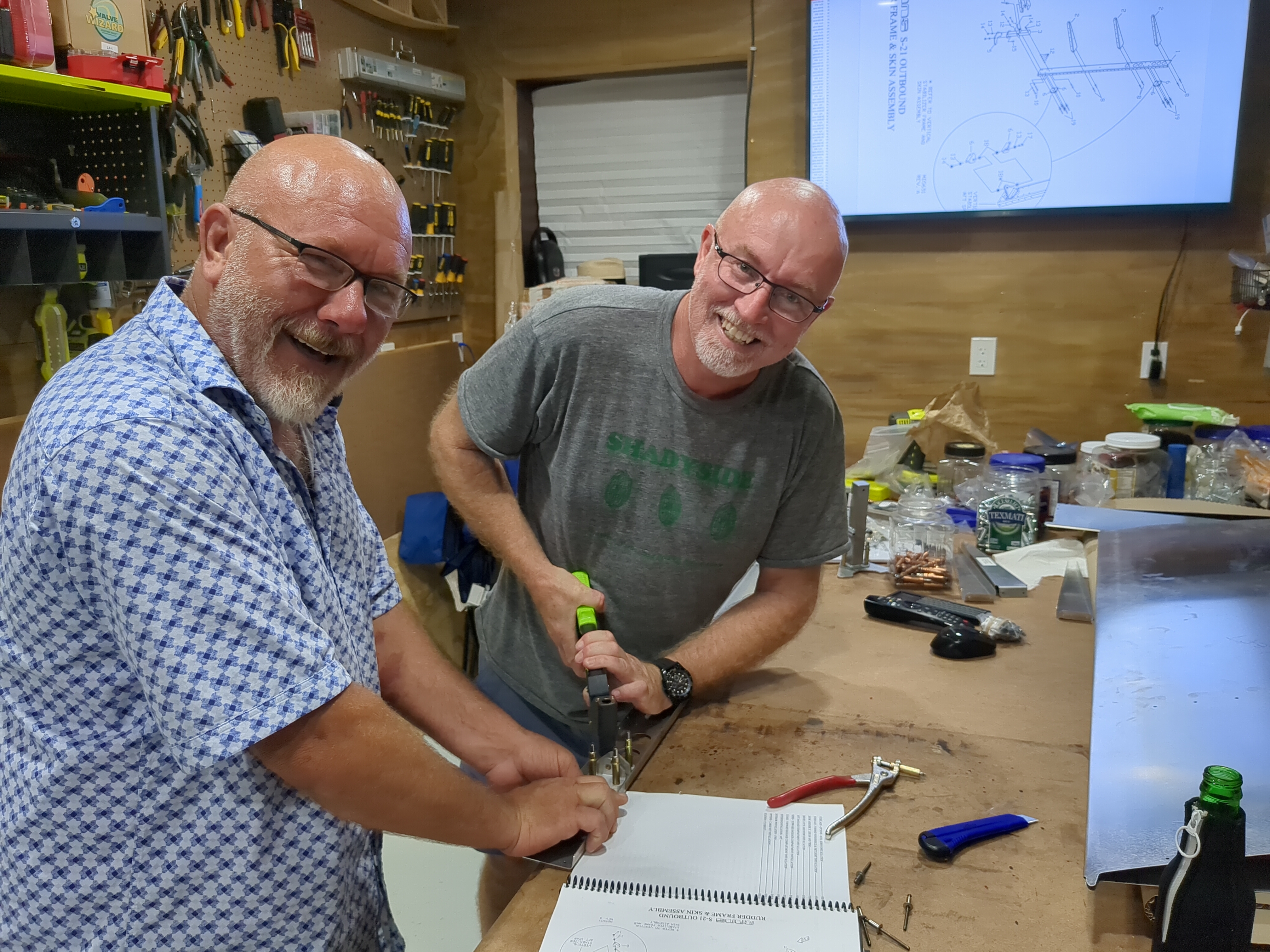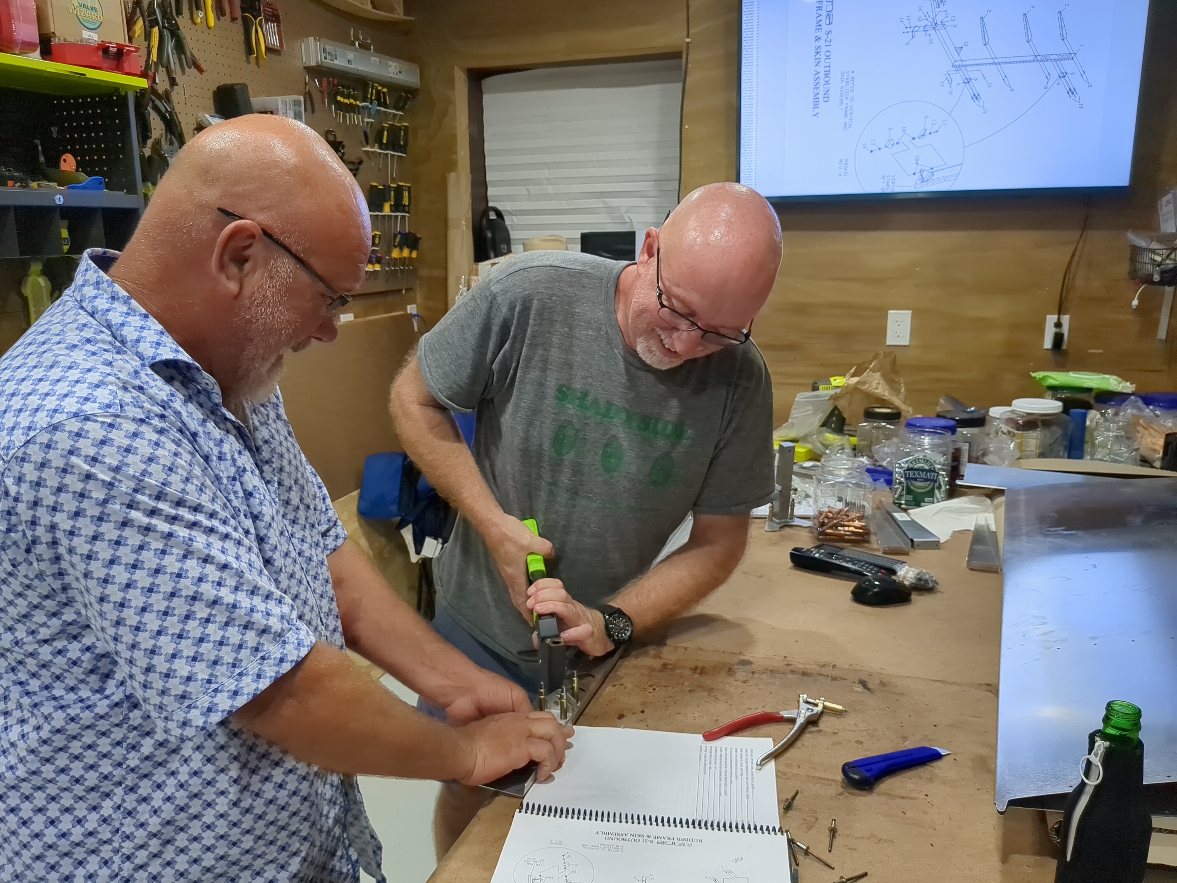 Put the first rivet into the rudder, pinned the top hinge supports, Thomas and A.D. managed to break the rivet puller with their awesome strength... Lucky I had a spare Stanley rivet puller from the aviation isle in Home Depot to get the job done.
