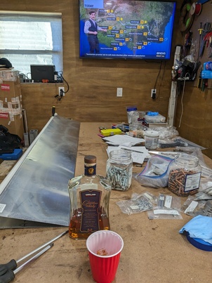 Pulled all the gear for the flaps, blue lined the pipe to roll the leading edge, tried to cleco the skin to the pipe, the blue line would not stay in the center... Realised I layed the pipe so one end was raised off the ground and it bent.. So the blue line wasn't lining up... Bought a new pipe, started again, lined up... Found the whiskey guys, Gary and Mark, had them come over and help roll the leading edges, drank some Kirkland "Crown"...